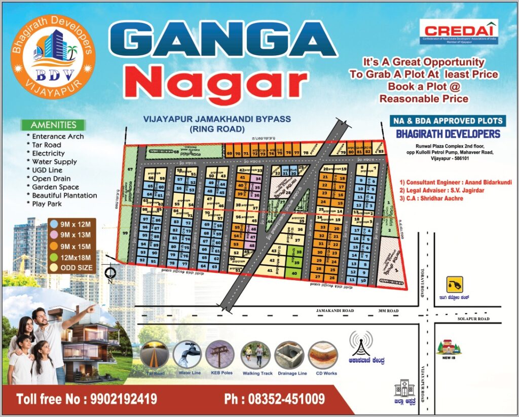 Ganga Nagar, developed by Bhagirath Developers (BDV), Vijayapura, is a well-planned N.A. residential layout strategically located on the Vijayapur–Jamakhandi Bypass (Ring Road). This project offers an excellent opportunity to own affordable residential plots in a fast-developing corridor with strong connectivity and growth potential.