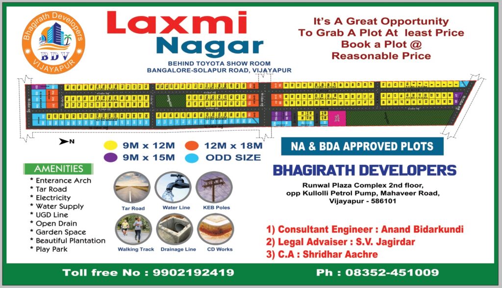 Laxmi Nagar is a thoughtfully planned residential layout by Bhagirath Developers, located behind Toyota Showroom on Bangalore–Solapur Road, Vijayapur. This project offers an excellent opportunity to own NA & BDA-approved plots at a reasonable and attractive price, making it ideal for both homebuyers and investors.