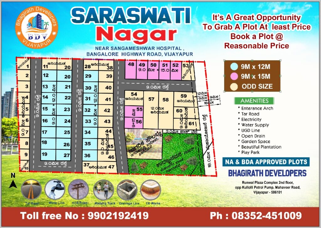 Saraswati Nagar is a well-planned residential layout by Bhagirath Developers, strategically located near Sangameshwar Hospital, Bangalore Highway Road, Vijayapur. Designed for comfort, convenience, and long-term value, this project offers an excellent opportunity to own a plot at a reasonable and affordable price.